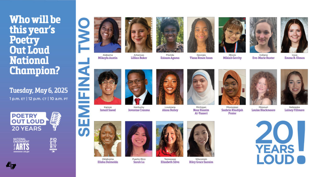 Visit PoetryOutLoud.org for the list of the 2025 Poetry Out Loud champions who will take part in the competition.